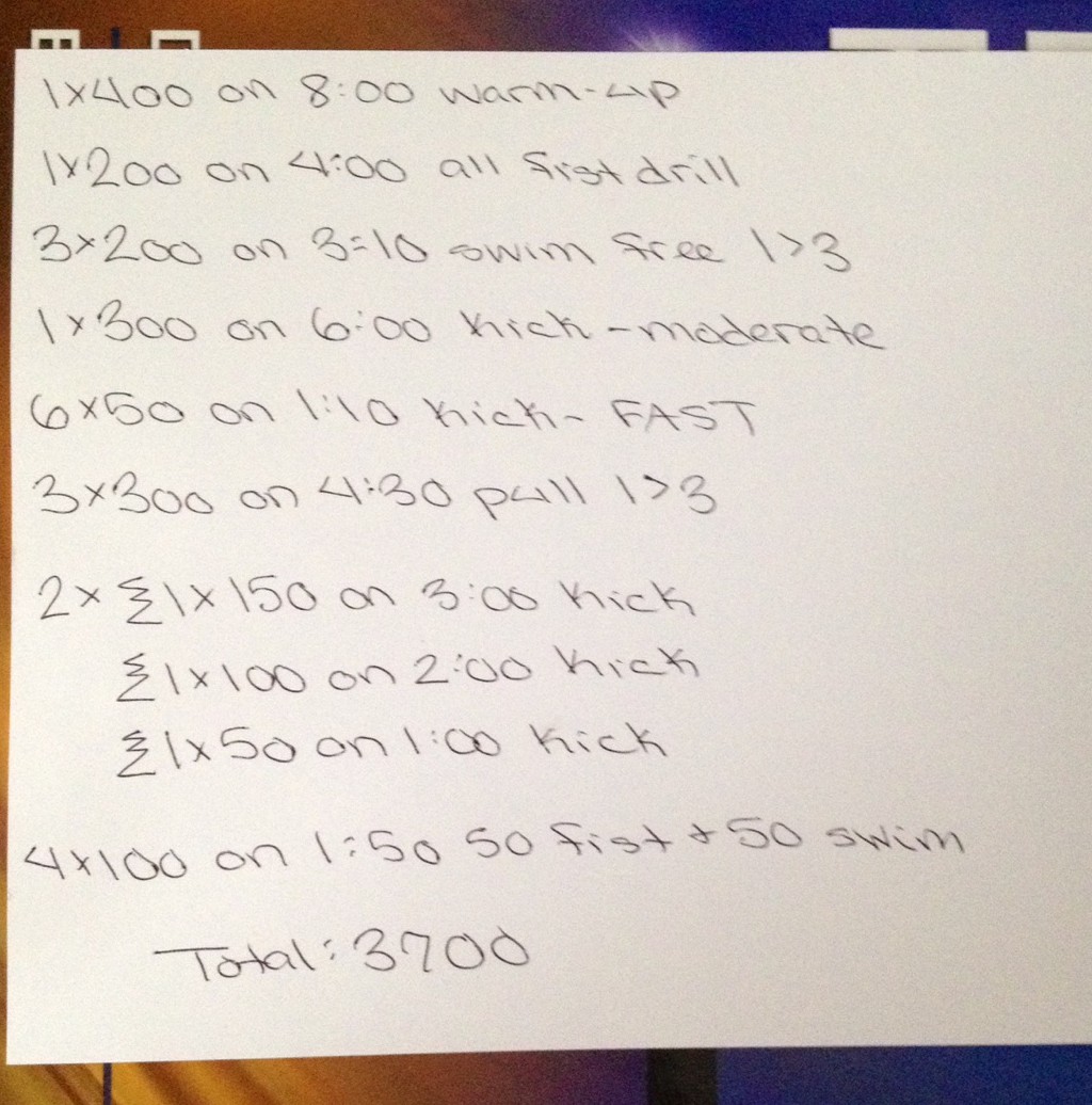 My Friday morning swim workout. Larger intervals to accommodate for the recovery week. Nothing too fancy or complicated, and no IM work.